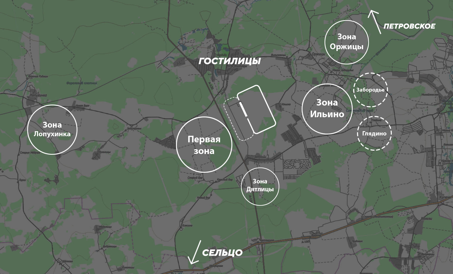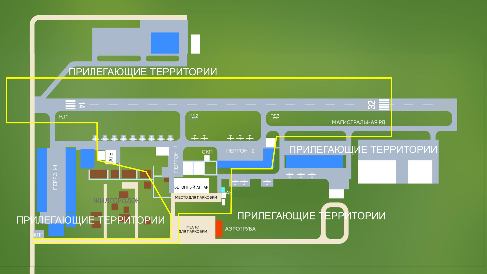 Желтым отмечена граница посадочной площадки "Гостилицы", а также зона границ объекта транспортной инфраструктуры. На посадочной площадке действует контрольно-пропускной режим. Посещение возможно только по согласованию с администрацией и только при условии оформления пропуска. Передвижение по площадке только в сопровождении и в свето-сигнальных жилетах.